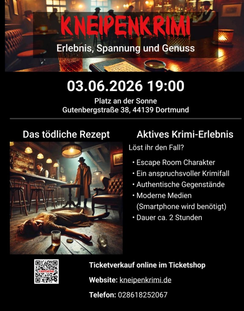 🎭🔐 KNEIPENKRIMI – Das tödliche Rezept – Ein spannendes Abenteuer bei euch vor Ort! 🍻 Erlebe einen interaktiven Abend im Krimi-Universum – Spannung, Rätsel & Gänsehautmomente inklusive 🎯. Sei dabei in Platz an der Sonne! Mystik, Hinweise, geheimnisvolle Charaktere und ein Fall, der erst Schluss macht, wenn der Täter entlarvt ist. 📍 Ort: Gutenbergstraße 38, 44139 Dortmund 📅 Datum & Uhrzeit: 03. June 2026, 19:00 🎟️ Jetzt Ticket sichern – sei Teil des Ermittler-Teams! #Kneipenkrimi #LiveKrimi #Rätselabend #SpannungPur